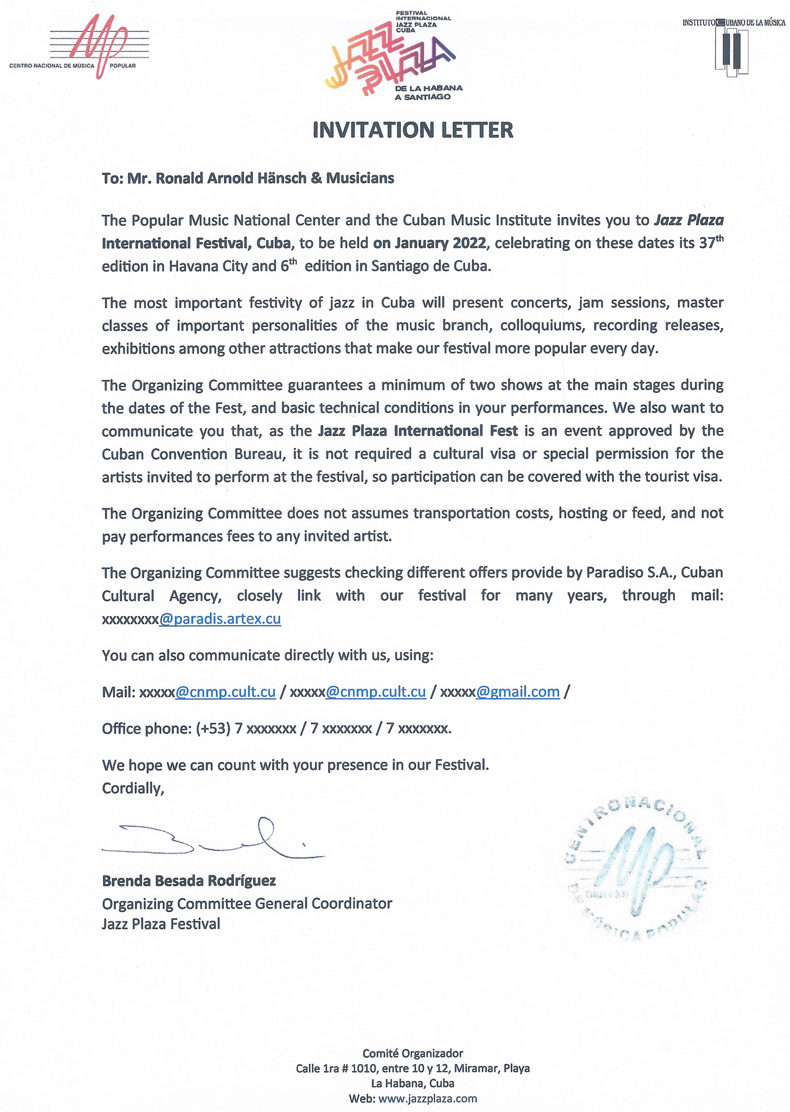 Erneute Einladung zum Jazzfestival "Jazzplaza 2022" auf Kuba